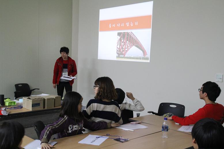 다리를 이용하여 힘의분산을 설명하는 이철웅학생