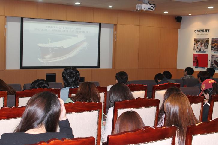 9시 정각 버스는 조선소에 들어갔고, 우리는 현대중공업 소개 영상을 관람했다. 영상이 끝난 후, 곧바로 버스를 타고 공장을 견학했다. 공장 부지가 너무 넓어서, 순회하기 위해 버스로 움직이면서 설명을 들었다. 어마어마한 공장 안에서는 생산자들이 자전거로 이동하는 모습이 인상적이었다. 순회가 끝나고, 안타깝지만 바로 조선소의 출구로 행해야 했다. 기대했던 조선소 견학은 40분 뿐이었고, 안타까운 마음으로 점심을 먹었다.