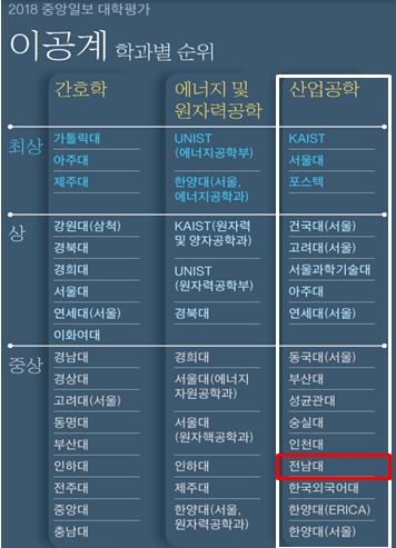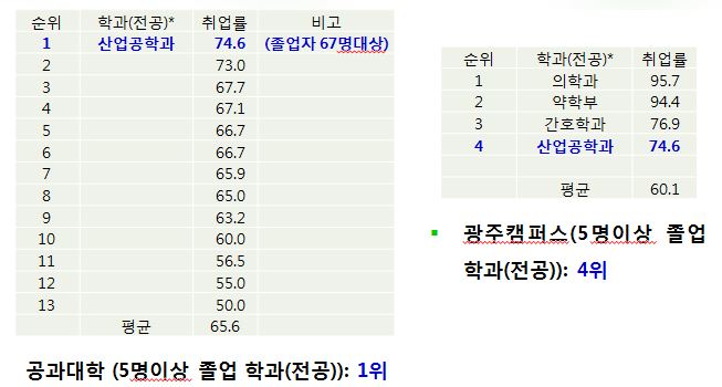 지난 2021년 1월 12일에 있던 대학알리미(www.academyinfo.go.kr) 대국민 공시에서 전남대학교는 취업률 59.1%(이하 학부, 2019년도 2월 졸업자(2018년 8월 졸업자 포함) 대상)를 기록하며 거점국립대학 중 2위를 기록했습니다. 이 중 산업공학과가 취업률 공시에서 졸업자가 5명 이상인 학과 중 공과대학 부분에서는 74.6%를 기록하며 1위를 기록하였고 전남대학교 전체에서는 의대 (95.7%), 약학대 (94.4%), 간호학과 (76.9%)를 이어 4위를 달성했습니다.