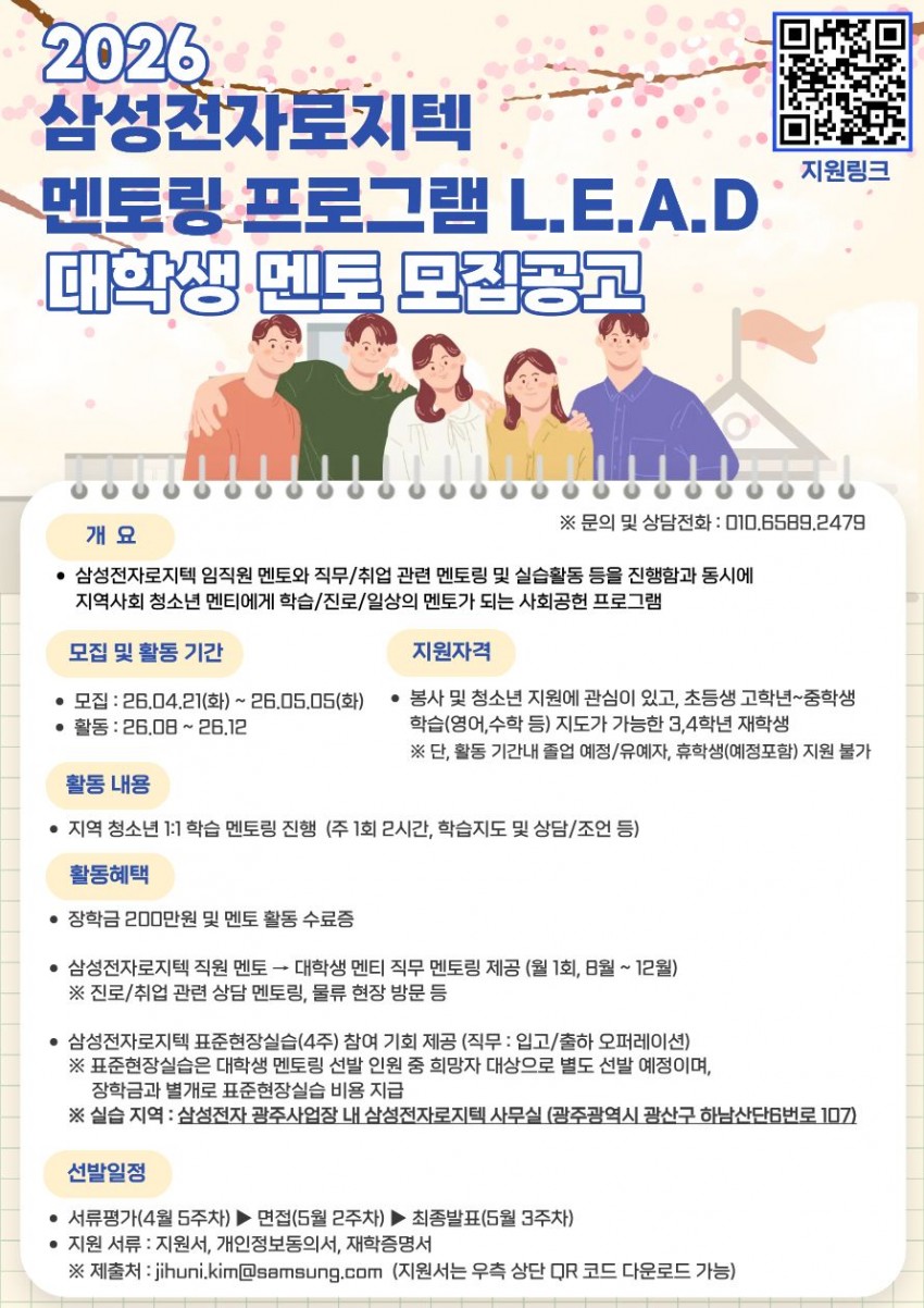 [장학] 삼성전자로지텍 2026 멘토링프로그램 L.E.A.D 모집(~5/5화) 舊꿈이룸멘토링 (대학생 멘토, LEAD)